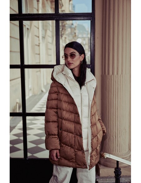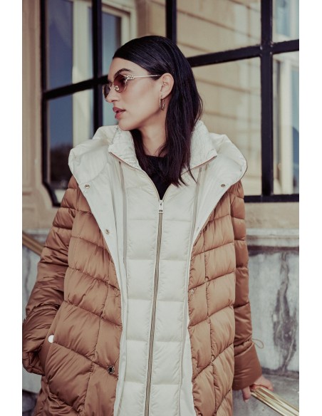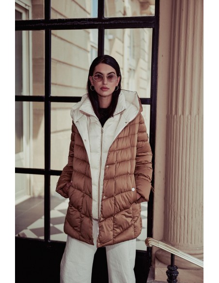 Plumífero acolchado bicolor de Donjaz. Presenta un cuello con capucha y un efecto de chaleco desmontable.